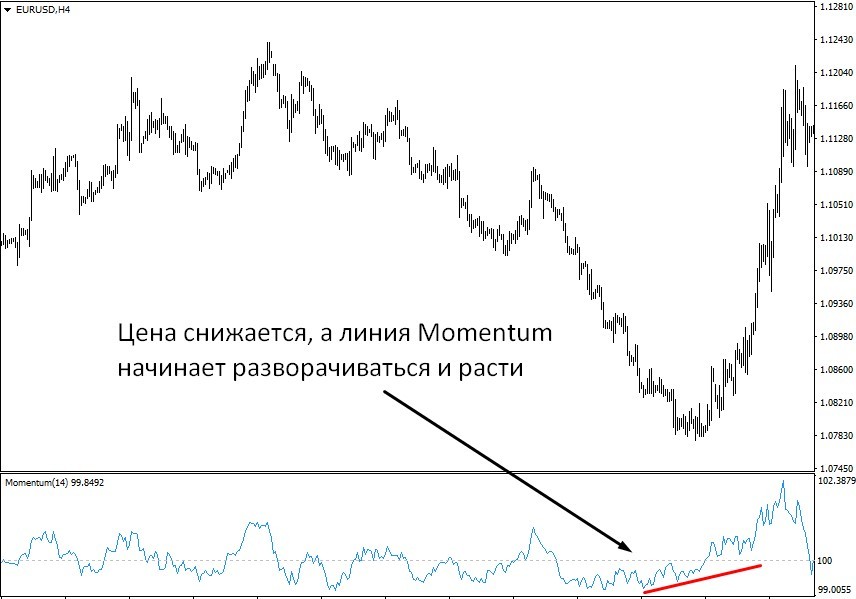 - Линия Momentum растёт. Это означает, что на рынке есть бычий тренд, то есть текущие значения баров превышают предыдущие. Важно отметить, что это соответствует ускоряющемуся тренду, так как значение линии растёт, а это возможно только тогда, когда разница между ценами также увеличивается.