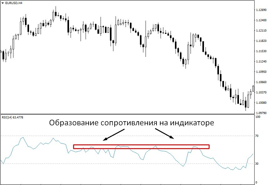 И, наконец, самое интересное, что есть в RSI – возможность анализа и получения сигналов по тому, что отрисовывает сама линия в окошке. Тут есть типичные сигналы, которые мы обычно смотрим на самом графике – формирование поддержек и сопротивлений. Также и индикатор RSI может показывать поддержки и сопротивления, они выражаются в том, что линия несколько раз отбивается от некоторого значения. Ещё один сигнал, схожий с этим – графические фигуры, например, Голова и плечи. Носит такой же разворотный характер. Но гораздо чаще на RSI можно увидеть фигуры продолжения тренда – флаг и вымпел, после которых обычно начинается движение в направлении, предшествовавшем появлению паттерна. А это означает также и продолжение движения на графике. В общем, подводя итог, можно сказать, что индикатор максимально универсальный и удобный, применение ему найдётся в рамках множества торговых систем, основанных на техническом анализе.