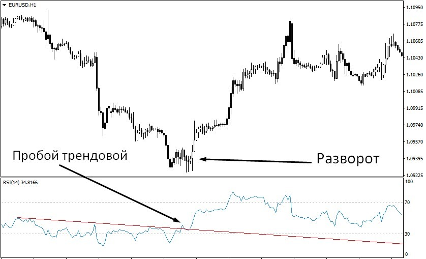 Индикаторы группы осцилляторов разнообразны, поэтому выбрать нужный для работы иногда бывает не так и просто. У каждого из лучших индикаторов 2020 года есть свои собственные особенности. Не является исключением и RSI. Он обладает тем же функционалом, что и прочие индикаторы из этой группы, но при этом у него есть отличительная особенность – по его линии можно проводить привычный многим графический анализ. То есть, мы можем построить трендовую линию, можем увидеть различные паттерны – треугольник, прямоугольник и так далее. Аналогично дело обстоит и с поддержками, сопротивлениями – они образуются некоторыми значениями индикатора, которые не удаётся пройти и от которых он отскакивает. Эта особенность стала одной из основных причин, почему RSI стал так популярен на форексе. Лучшие результаты получаются на крупных периодах, но в принципе можно применять этот осциллятор и на тайм фреймах до М15, он эффективно показывает развороты, а также классические сигналы – дивергенции.