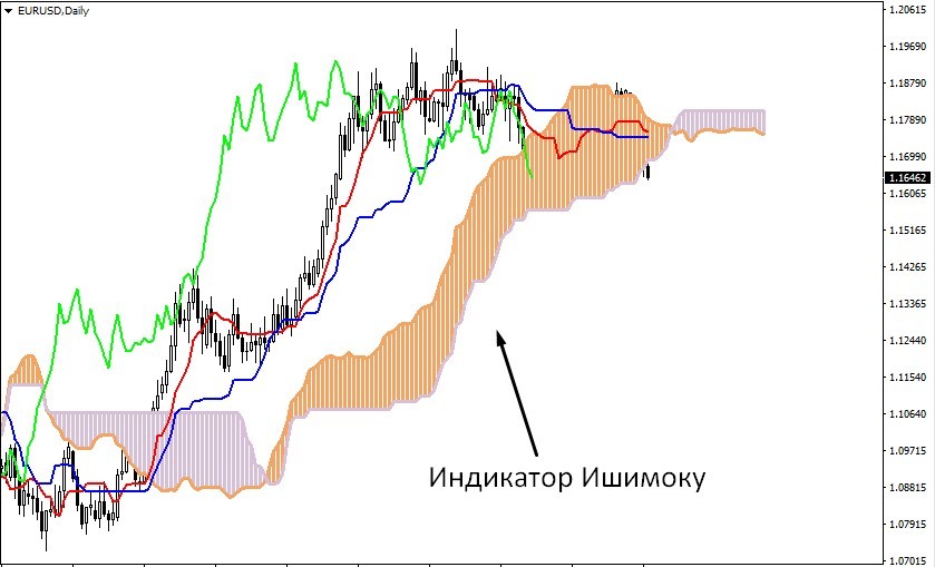 Трендовые индикаторы обычно довольно просты, но Ишимокудостаточно сильно выделяется на фоне остальных разработок. Это связано с тем, что он многокомпонентный, анализ ведётся по достаточно большому числу составляющих, из-за этого такие индикаторы многие игнорируют. И напрасно, так как освоить Ишимоку не сложно, а пользы этот индикатор может принести очень много в торговле на форексе. Поэтому, мы включаем его в рейтинг лучших индикаторов 2020 года. Ишимоку строится вокруг усреднения и изначально он предполагает работу с крупными тайм фреймами, самые лучшие результаты получаются на дневном периоде. При этом индикатор достаточно универсален – он может применяться как в трендовой торговле, так и в рамках консолидаций, для этого есть все предпосылки в виде сигналов пересечения скользящих средних, а также облака, которое может выступать и поддержкой, и сопротивлением. За свою более, чем полувековую историю множество трейдеров смогли заработать немалые деньги, используя этот уникальный алгоритм.