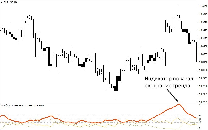 - Движение основной линии дальше, индикатор ADX пересекает отметку в 40. Сразу можно сказать, что при стандартных настройках это обычно означает, что тренд скоро развернётся. Диапазон до 40 можно использовать как трендовый, а вот после 40 это уже скорее говорит о скором развороте или, как минимум, замедлении. Не стоит забывать, что на форекс высокая волатильность, поэтому индикатор ADX может оказать существенную помощь в поиске оптимальной точки для выхода из позиции.