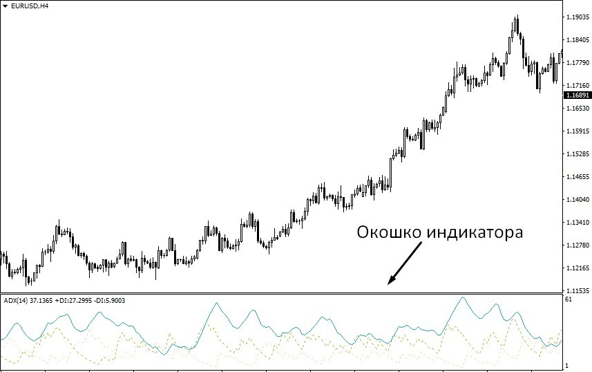 Теперь индикатор становится визуально понятным и данные с него легко читать. Итак, как не сложно догадаться, алгоритм ADX оценивает движения, направленные вверх и движения, направленные вниз. Когда какое-либо из направлений начинает преобладать, мы это видим в окошке индикатора по расположению линий. Сами линии означают следующее: