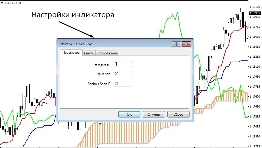 Открыв панель настроек, мы увидим всего лишь три значения параметров. Связано это с тем, что основными рабочими линиями являются только три, а две из них по сути вспомогательные и образованы от первых. Происходит это за счёт смещения по временной шкале. Очень важно настроить цветовую схему таким образом, чтобы не путать сигнальные линии. Настройки индикатора Ишимоку по умолчанию подразумевают использование стандартной цветовой схемы метатрейдера – зелёный график на чёрном фоне.