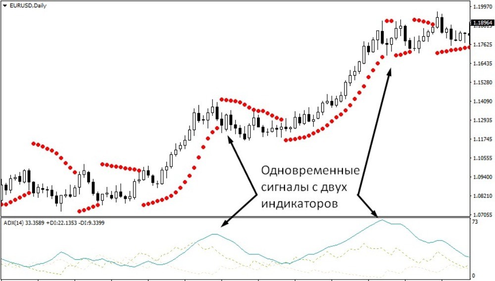 4. Комбинировать индикатор Parabolic SAR с индикатором ADX. Одна из самых удобных и часто используемых комбинаций индикаторов. Действительно, что может быть лучше компиляции из указателя тренда и оценки его силы. В этом случае мы используем показания параболик сар для выявления наличия тренда, а индикатор силы в качестве подтверждения. После двух точек Parabolic SAR ждём роста соответствующих линий на АДХ, если тренд медвежий и точки над графиком, то нас интересует увеличение показателя линии –DI и общей линии силы тренда, для бычьего всё наоборот – точки под графиком и рост линий +DI и общей. Это сочетание значительно повышает точность входов, так как наличие начала тренда при слабой силе вероятнее всего окончится быстрым разворотом, в то время как мощное начало обычно сулит сильное продолжение. В общем, это практически идеальная комбинация с Parabolic SAR, элементы которой дополняют друг друга и фильтруют ложные сигналы.