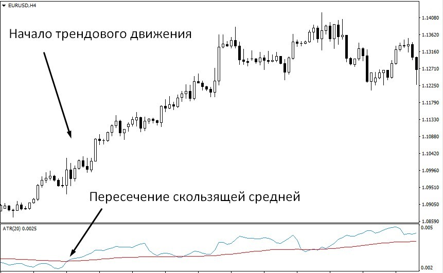 Следующий вариант применения индикатора заключается в нанесении на него дополнительного индикатора – скользящей средней с большим периодом. В этом случае она будет двигаться практически горизонтально и как бы разделит область значений ATR на две – ниже мувинга будет период консолидации и снижения рыночной активности, а при пересечении линии скользящей средней вверх будет получаться сигнал к росту волатильности. При этом, разумеется, нужно смотреть на направление тренда и другие сигналы, то есть индикатор ATR в этом случае просто выступает в качестве вспомогательного инструмента, он не используется как самостоятельный метод анализа.