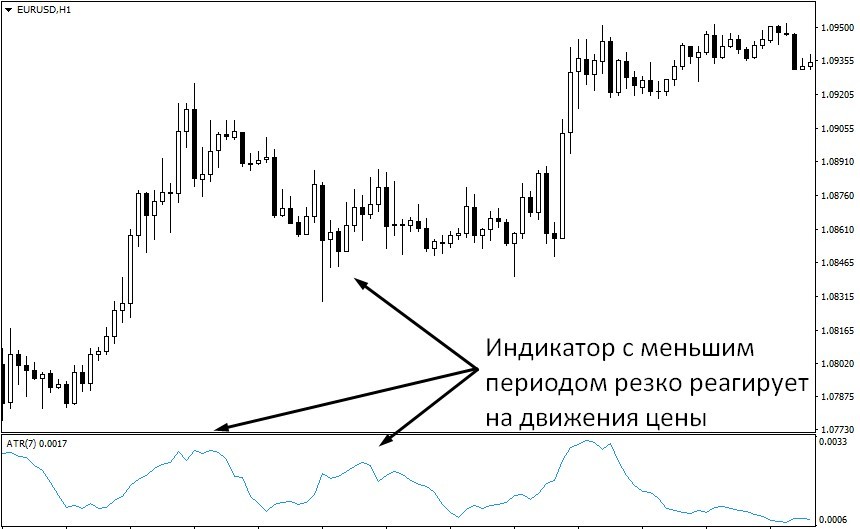 - Уменьшать период. В этом случае ATR будет показывать диапазоны за небольшой промежуток времени и нельзя сказать, что ситуация не изменится достаточно быстро. Подвижность линии возрастает, она постоянно колеблется. Опускать период ниже 7-8 не имеет смысла, так как в этом случае индикатор становится не очень информативным даже на крупных тайм фреймах.